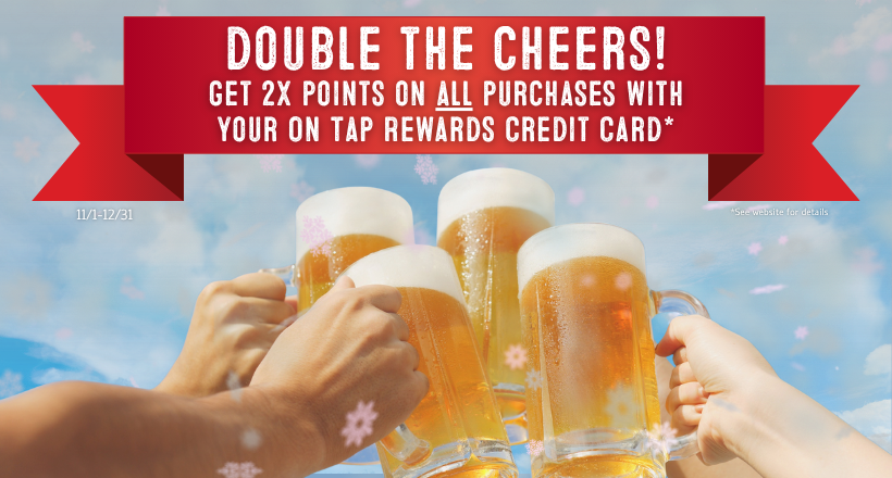 *2X Reward Points Credit Cards - Offer valid 11/1/25–12/31/25 for current On Tap Credit Union Rewards Credit Card Cardholders. 2X points (2 points per $1) applies to all transactions. Points post within 2 billing cycles. Account must be in good standing. Offer may be modified or withdrawn without notice.